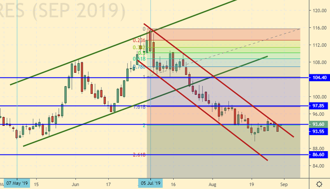 Сценарий роста: рассматриваем сентябрьский фьючерс, дата экспирации 18 сентября. Медведям надо дожимать ситуацию. А быкам надо дать позволить это сделать. Когда рынок уйдет к 86.60 всем станет легче. Движение вниз структурно завершится, и откатить можно будет без особых проблем. Например, в район 104.0. Пятничный, достаточно пассивный выход из канала, как сигнал для покупки не рассматриваем. При падении в район 87.00 покупать обязательно.
