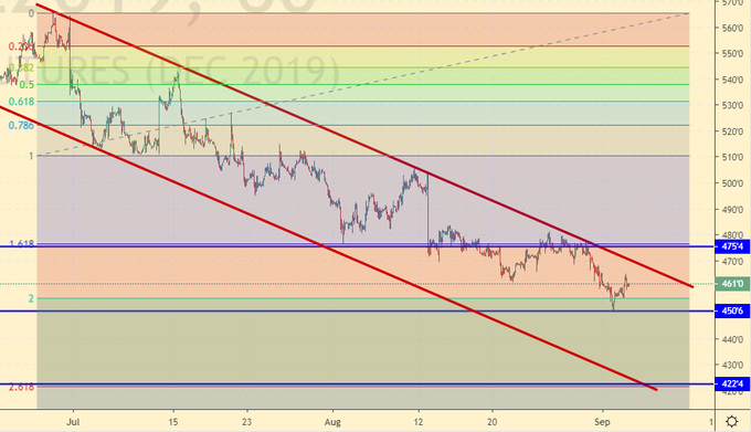 Золото: несмотря на спад напряженности в мире (Гонконг, Brexit) вчера мы не увидели на рынке продавцов. Это лишний раз подтверждает мысль, что держатели контрактов на золото не спешат расставаться с ними, прогнозируя далеко не самую простую осень. Если каким-либо образом США попытаются «простить» долг в 1 триллион долларов, который есть у Китая, в канве взаимных актов борьбы за влияние в мире, ведь это же конечная цель торговой войны, у золота просто блестящие перспективы. Держим лонги или входим в них. Первая цель 1600.