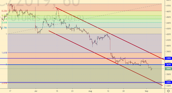 Кукуруза (сентябрьский контракт, CME Group, исполнение 13.09.2019)