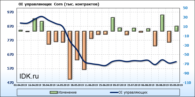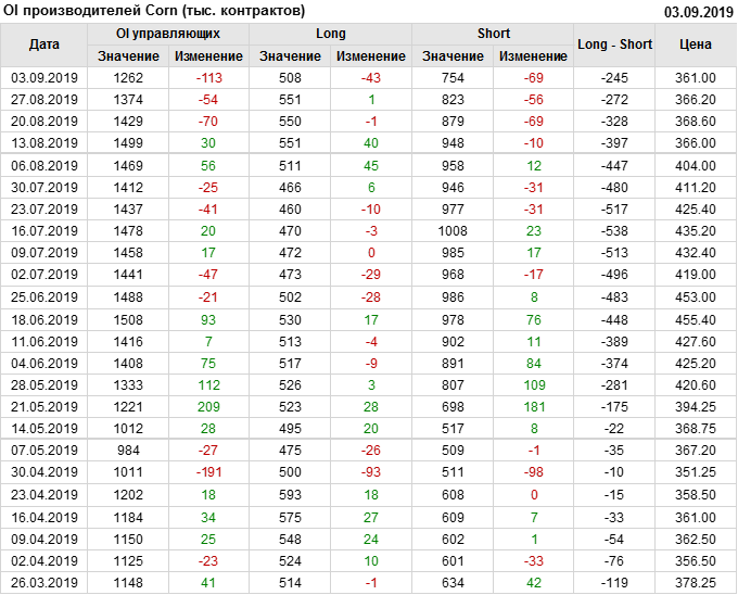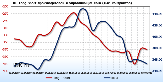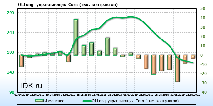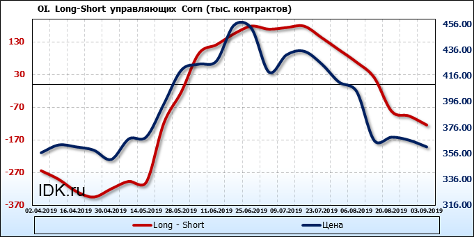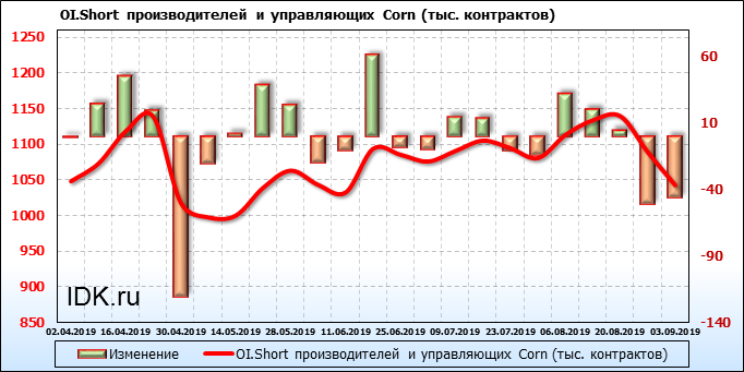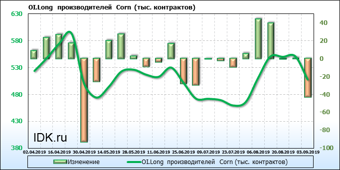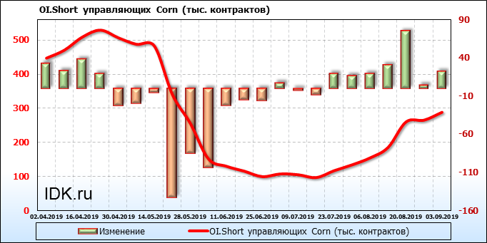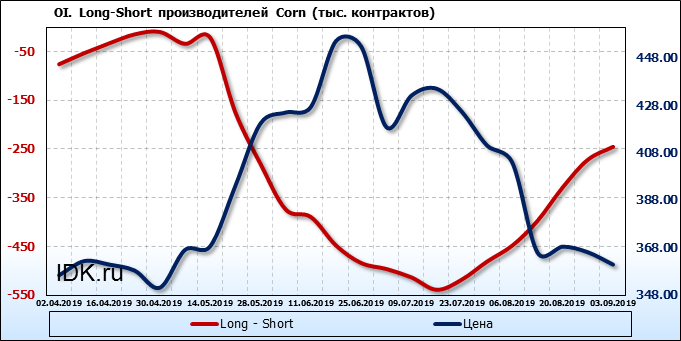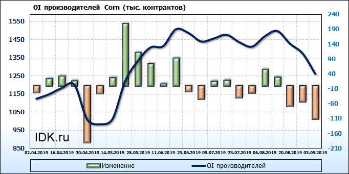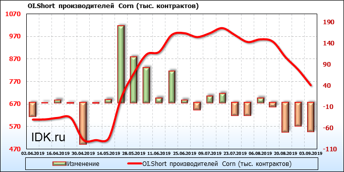 За прошлую неделю, 28.08.19 — 03.09.19, разница между длинными и короткими позициями производителей выросла на 26 тыс. контрактов. В тоже время, цена упала на 5.2 цента. Производители перестали наращивать короткие позиции, что говорит или о непривлекательности текущих ценовых уровней для хеджирования, или о том, что часть участников рынка заняла выжидательную позицию.