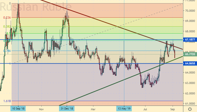Сценарий падения: в текущей ситуации должны уходить к 64.00. Но проход к 64.00 будет означать, что мы остаемся под долгосрочной линией сопротивления. А ход ниже 63.80 – это уже сигнал хода к 60.00. Если вы продали после пробоя вниз 66.50 – держите позицию. Если нет, то продавайте при откате к 66.00.