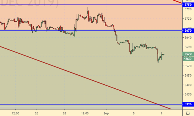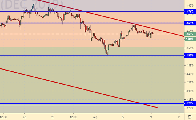 Пшеница: нам есть куда падать. Вряд ли до отчета USDA 12-го сентября мы увидим рост. Если мы с текущих уровней пойдем вверх, то картинка не будет выглядеть технически завершенной и к росту постоянно будут в голове возникать вопросы. Что это? Куда? Зачем? Пока мы ниже 470.0, считаем продолжение падения возможным.