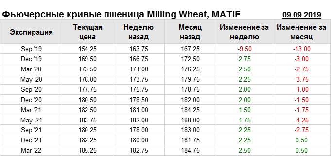 На 09.9.2019 стоимость пшеницы Milling Wheat на бирже MATIF по контракту Sep ’19 составила 154.25 евро за тонну. За прошедшую неделю стоимость пшеницы Milling Wheat упала на 9.5 евро/тонна. Как мы видим на графике, фьючерсная кривая имеет периоды, когда более дальний фьючерс дешевле ближнего. Состояние бэквардации наблюдаем на следующих контрактах: Sep ’21. Таким образом, трейдеры предполагают, что возможно превалирование предложения над спросом в указанные периоды.