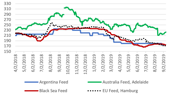 Тем не менее ожидается, что рост импортного спроса будет ограниченным из-за изменений в ведущих странах-импортерах. Саудовская Аравия переходит от использования сырого ячменя в качестве корма к готовым кормам для повышения эффективности использования кормов. Импорт Китая от его крупнейшего поставщика, Австралии, замедлился на фоне продолжающегося антидемпингового расследования. Любой рост кормового потребления в Китае, вероятно, будет сдерживаться гибелью животных от африканской чумы свиней. На долю Саудовской Аравии и Китая приходится в совокупности 60 процентов мирового импорта ячменя.
