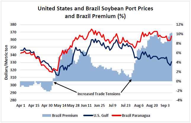 В период взлетов и падений торговых переговоров между США и Китаем, надбавки к цене на соевые бобы в Бразилии, похоже, являются точным показателем степени напряженности переговоров. Когда напряженность нарастает, в Бразилии растут премии на соевые бобы в Паранагуа против Мексиканского залива США. Точно так же, когда напряженность спадает, премии постепенно сокращаются. Эти ценовые премии росли и падали в рамках глобальных ценовых колебаний, которые были сфокусированы на ситуации с урожаем в США в 2019 году. Цены выросли как в Соединенных Штатах, так и в Бразилии, так как влажные условия препятствовали посеву кукурузы и сои в Соединенных Штатах, а высокий уровень воды в реках повысил стоимость перемещения соевых бобов к Мексиканскому заливу в США. По мере улучшения условий цены на сою в Бразилии и США снижались.