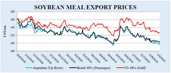 Американские экспортные цены на соевые бобы в августе FOB Gulf в среднем составляли 337 долл. / т, что на 14 долл. меньше, чем в июле. Средняя цена Paranagua в Бразилии составила 364 доллара за тонну, что на 6 долларов больше, чем в июле. В Аргентине Up River FOB в среднем составила 347 долларов за тонну, что на 6 долларов больше, чем в прошлом месяце. Американские экспортные цены на соевый шрот (FOB Gulf) в августе в среднем составляли 334 долл. США / т, что на 14 долл. США меньше, чем в июле. Средняя цена Paranagua FOB в Бразилии составила 308 долларов за тонну, что на 10 долларов меньше, чем в июле, а цена в Аргентине Up River FOB составила в среднем 305 долларов за тонну, снизившись на 12 долларов по сравнению с предыдущим месяцем. Цены в Мексиканском заливе в США снижались с середины июля из-за улучшения перспектив урожая и сейчас почти на 7 процентов ниже, чем в прошлом году. Цены в Бразилии в настоящее время на 10 процентов выше, чем цены в США по состоянию на 10 сентября 2019 года.