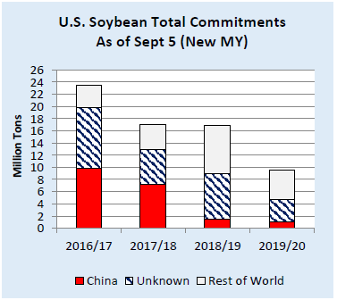 Окончательный накопленный экспорт сои из США в Китай в 2018/19 г. составил 13,4 млн. тонн и 33,4 млн. тонн в остальные страны мира. На 2019/20 год обязательства по экспорту сои (неоплаченные продажи плюс накопленный экспорт) в Китай составили 1,1 миллиона тонн против 1,5 миллиона год назад. Общие обязательства перед миром составили 9,5 млн. тонн по сравнению с 16,9 млн. за аналогичный период прошлого года. Отложенные продажи составили 864 300 тонн в Китай и 8,2 миллиона для остальных стран мира. В прошлом году в это время объем отложенных продаж в Китай составлял 1,4 миллиона тонн, а в остальные страны — 14,7 миллиона.