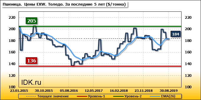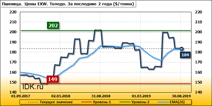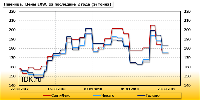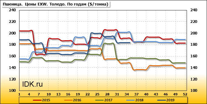 Внутренние цены на пшеницу SRW в городе Толедо (США) упали на 10.7 $/т. и на отчетный месяц составляют 183.63 доллара за тонну.