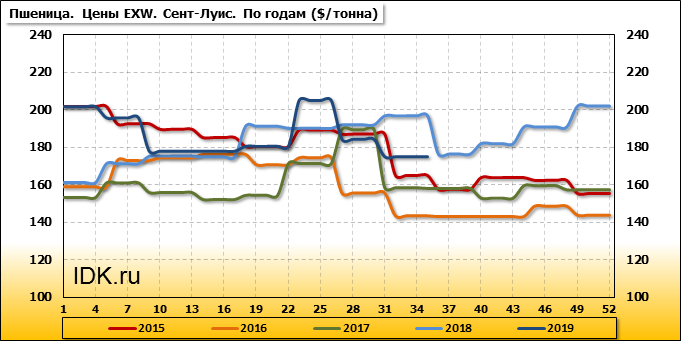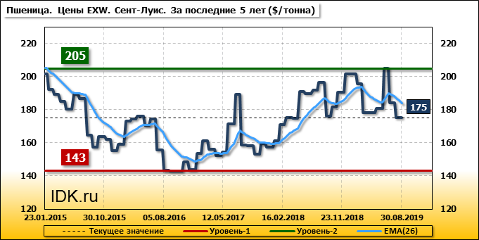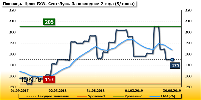 За прошедший месяц внутренние цены на пшеницу SRW в Сент-Луисе (США) упали на 9.2 $/т. и на отчетный месяц составляют 175.17 доллара за тонну.