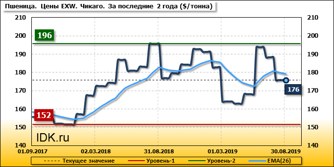 В Чикаго (США) внутренние цены на пшеницу SRW упали на 12.5 $/т. и на отчетный месяц составляют 175.9 доллара за тонну.