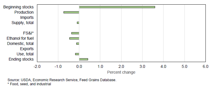 Урожайность кукурузы по стране прогнозируется на уровне 168,2 бушеля на акр, что на 1,3 бушеля меньше, чем в прошлом месяце, на основании первого отчета Национальной службы сельскохозяйственной статистики при Министерстве сельского хозяйства США (NASS). Если прогноз будет реализован, урожай составит 13 799 млн. бушелей, что на 102 млн. меньше, чем в прошлом месяце. Сочетание этого объема с увеличением начальных остатков на 85 млн. бушелей дает общий объем предложения на уровне 16 295 млн. бушелей, что на 291 млн. меньше, чем в прошлом году. Кормовое и остаточное потребление и экспорт не изменились по сравнению с прогнозом прошлого месяца.