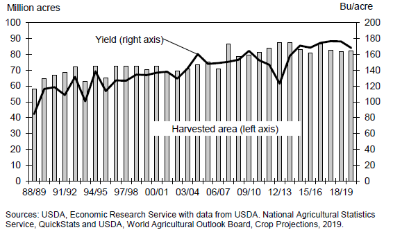 Рисунок 2. Уборочная площадь и урожайность кукурузы в США.