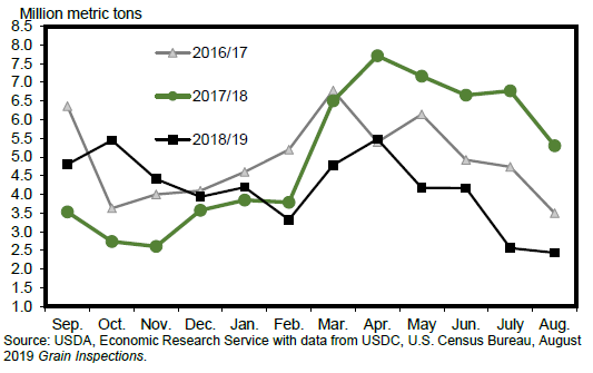 Экспорт американской кукурузы начал резко замедляться в июне с резким повышением цен, и в августе спад продолжился, при этом объем инспекций составил всего 2,4 миллиона тонн, что является одним из самых низких уровней экспорта кукурузы в августе для США с 1986 года. Еще двумя годами с низкими уровнями продаж в августе были 2012 и 2013, когда годовой экспорт США достиг лишь 38,2 и 18,2 млн. тонн соответственно. Это говорит о том, что экспорт будет ниже ожидаемого как в августе, так и в сентябре, в то время как экспорт конкурентов в Южном полушарии, а вскоре и Украины, будет расти.