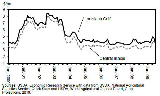 Рекордные урожаи кукурузы в 2018/19 году и ослабление валюты в Бразилии и Аргентине повысили ценовую конкурентоспособность этих двух стран по сравнению с Соединенными Штатами в конце 2018/19 торгового года (октябрь-сентябрь). Хотя с приближением сбора урожая в США разница в ценах между этими странами и Соединенными Штатами сокращается, ожидается, что Соединенные Штаты не станут более конкурентоспособными по цене с Аргентиной или Бразилией до конца января 2020 года.