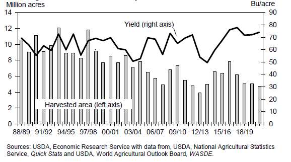 Сокращение конечных остатков 2018/19 года приводит к тому, что начальные остатки 2019/20 года также сокращаются на те же 5,0 млн. бушелей до 54,9 млн. Дальнейшее сокращение предложения в 2019/20 г. обусловлено небольшим сокращением NASS ожидаемой уборочной площади на 0,050 млн. акров, что частично компенсируется увеличением прогноза урожайности на 0,4 бушеля на акр. Уборочная площадь теперь прогнозируется на уровне 4,7 млн. акров, а урожайность — 74,3 бушелей на акр. Эти изменения приводят к общему сокращению предложения на 7,2 млн. бушелей в 2019/20 году. Изменений в потреблении не ожидается, поэтому прогнозируемые конечные остатки снижены на 7,2 млн. бушелей до 46,5 млн.