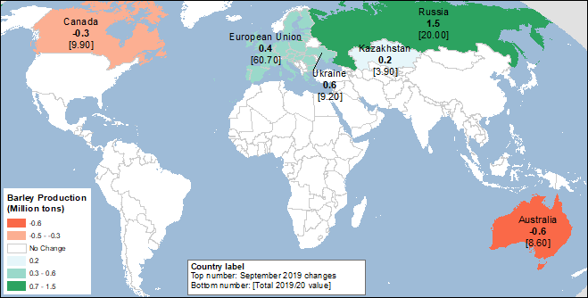 Карта 1. Изменения производства ячменя для 2019/20 года (млн. тонн), сентябрь 2019.