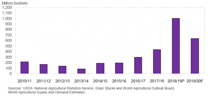 Рисунок 1. Остатки сои на конец сезона 2019/20 сократятся из-за значительного уменьшения урожая.