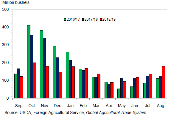 Аналогичным образом, экспорт сои из США завершил 2018/19 год ростом. Августовские экспортные инспекции соевых бобов составили 180 млн. бушелей и достигли исторического максимума для этого месяца. Данные маркетингового года с сентября по август показывают нетипичный график экспорта. Августовские поставки были почти такими же высокими, как в октябре и ноябре. Необычайно сильное оживление экспортного спроса в США этим летом было связано с конкурентоспособными ценами и замедлением поставок из Бразилии. На долю Китая пришлась большая часть августовского прироста поставок сои из США, которые выросли после того, как продажи, которые были зарезервированы в начале этого года, наконец, были отправлены. Как следствие, USDA повысило оценку экспорта США в этом месяце в 2018/19 году на 45 миллионов бушелей до 1,745 миллиарда. В то время как высокий спрос этим летом снижает переходящие остатки сои на 65 млн. бушелей по сравнению с предыдущими ожиданиями, пересмотренный прогноз в 1,005 млрд. бушелей по-прежнему является рекордно высоким.