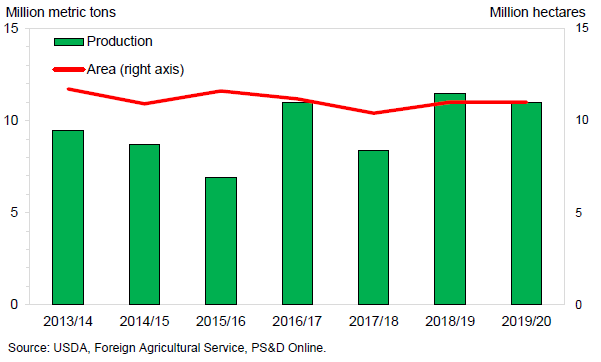 Прогноз производства сои в Канаде в 2019/20 году повышен на 300 000 тонн в этом месяце до 6,5 млн. тонн. Рост производства основан на недавнем официальном опросе, который показал, что посевная площадь соевых бобов в этом году на 100 000 га превышает весенние намерения фермеров, особенно в Онтарио. Площадь посевов сои Канады на 2019/20 год оценивается в 2,3 млн. га. Однако, по сравнению с прошлым годом, сокращение площади превышает 9 процентов и в значительной степени является причиной ожидаемого сокращения производства на 11 процентов. Как и в Соединенных Штатах, урожайность соевых бобов в Канаде будет ограничена поздним началом посева и летней засухой. Ожидается, что дополнительное производство увеличит экспорт канадской сои в 2019/20 году на 200 000 тонн до 4,6 миллиона.