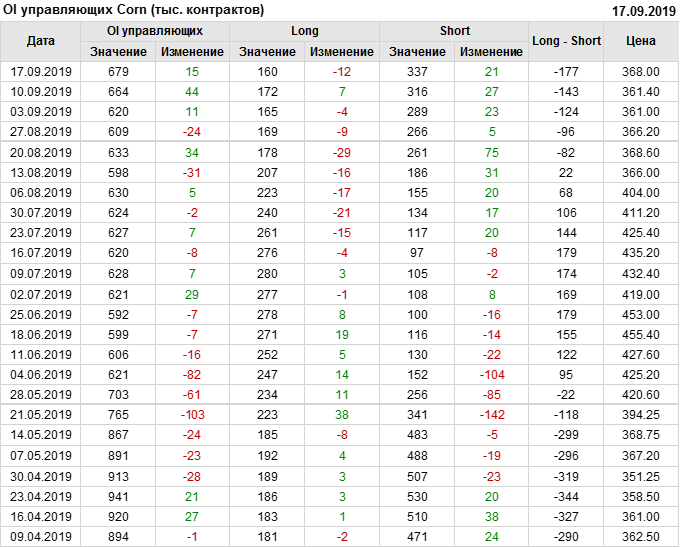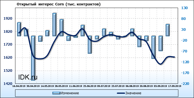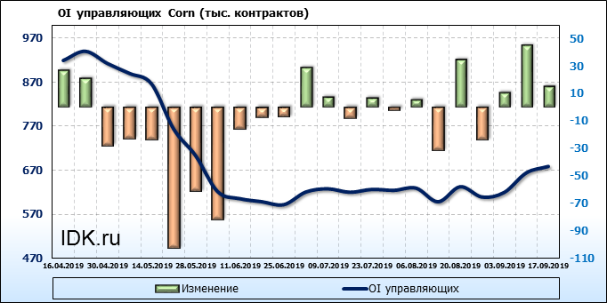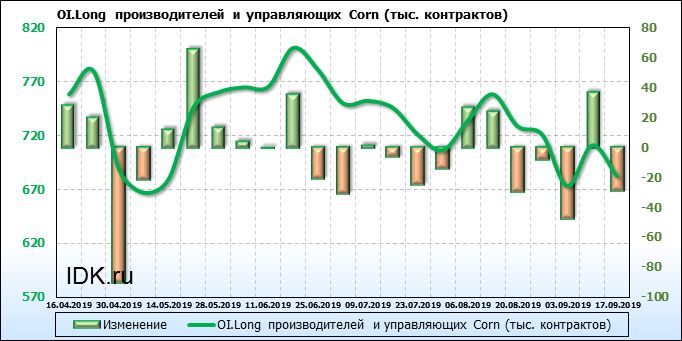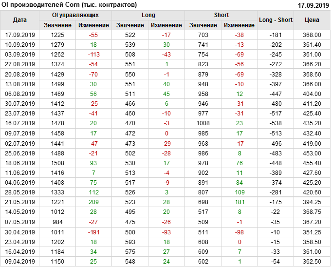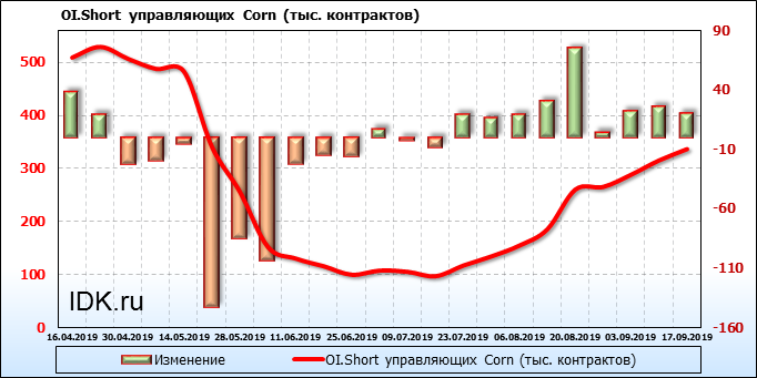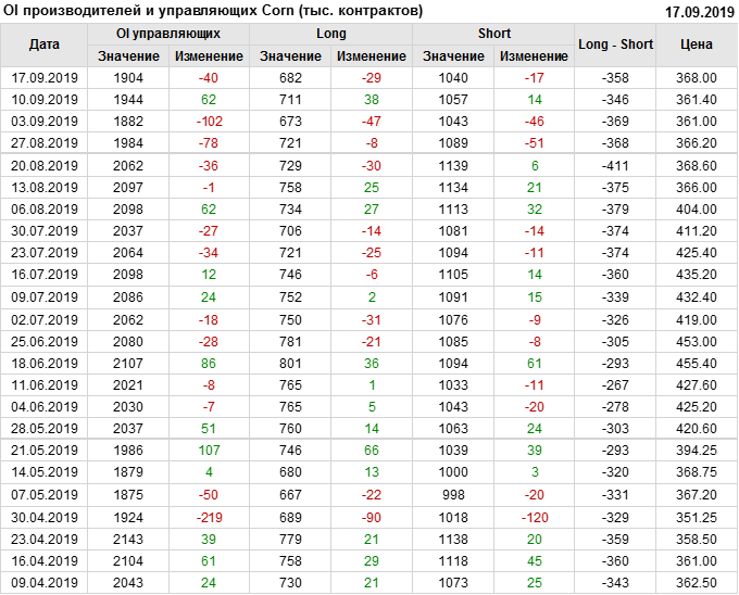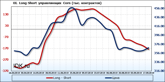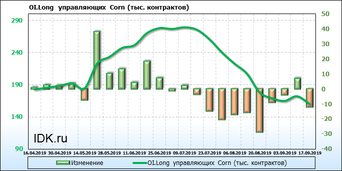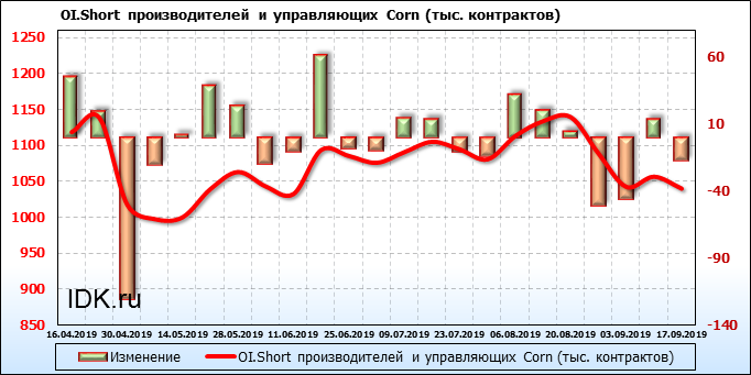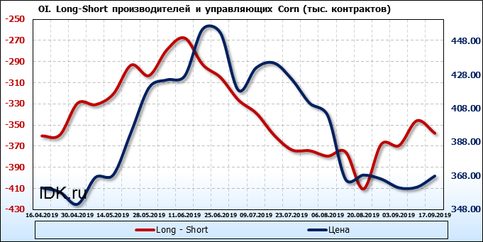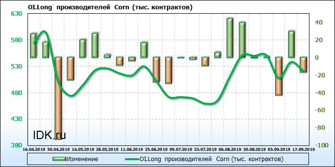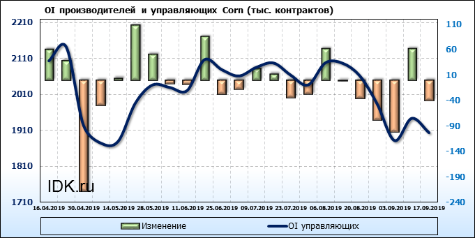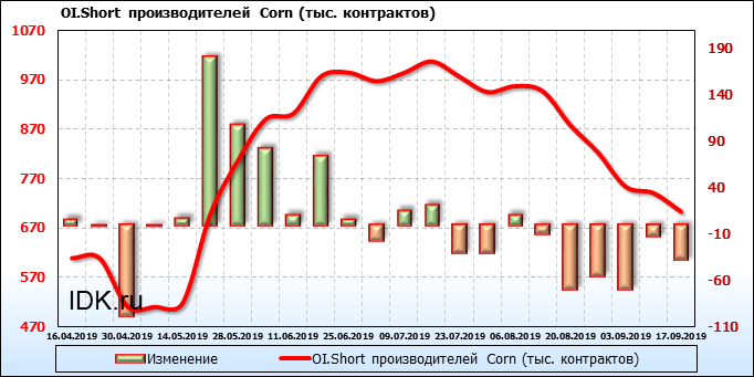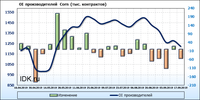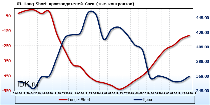 За прошлую неделю, 11.09.19 — 17.09.19, разница между длинными и короткими позициями производителей выросла на 21 тыс. контрактов. В тоже время, цена выросла на 6.6 цента. Производители не торопятся наращивать продажи, предполагая, что возможен рост цены в ближайшее время.