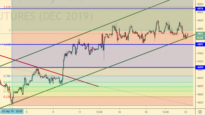 Пшеница: уровень 480.0 продолжает оставаться для нас основной поддержкой на данный момент. Пока мы выше – идем вверх. Если медведям удастся протолкнуть рынок вниз, то быков могут очень сильно потрепать. Новостной фон будет такой, что большие переходящие запасы давят на цены. Если рассматривать сценарий движения вниз, то в случае разочарования от переговоров Вашингтон – Пекин цены могут снизиться до 400.0, хотя это и нетипичный сценарий для осени.