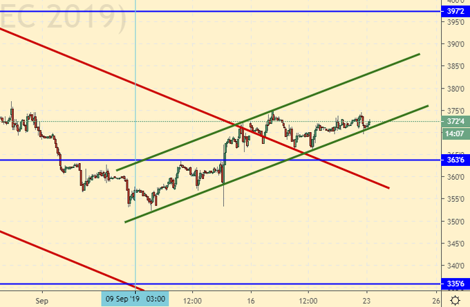 Кукуруза: хотим к 380.0, но торговая война не пускает. Видим, что сейчас мы находимся у нижней границы растущего канала, но пришли мы туда не в результате отката, а в результате диапазона. Одно неловкое движение на пульте, и мы снизимся к 370.0, а это намек на пробой и дальше в течение двух часов весь бычий рост будет аннигилирован. Поэтому, подожмем стоп-ордера.