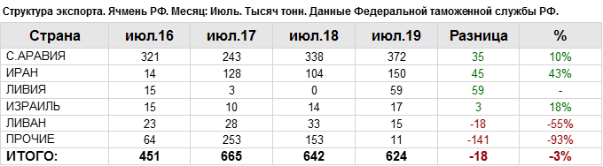 Объем поставок ячменя на экспорт за июль 2019 года в Саудовскую Аравию составил 372.45 тыс. тонн, что на 34.57 тыс. тонн больше объема поставок в данную страну в прошлом сезоне на тот же отчетный месяц.