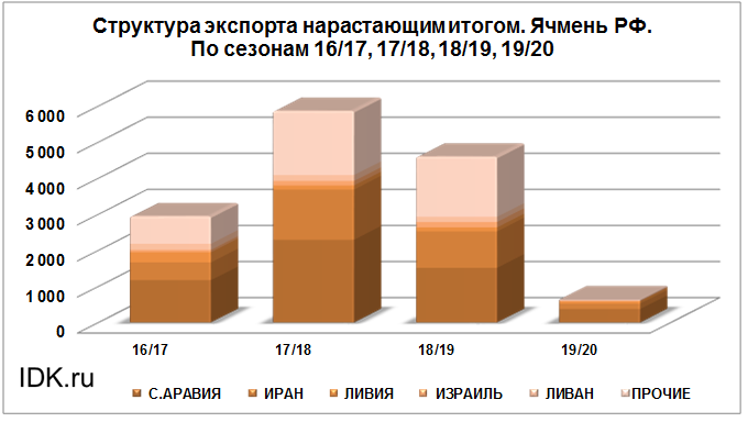 Структура экспорта ячменя из России нарастающим итогом по сезонам