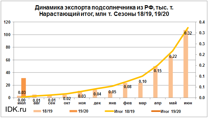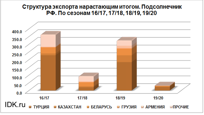 Структура экспорта подсолнечника из России нарастающим итогом по сезонам
