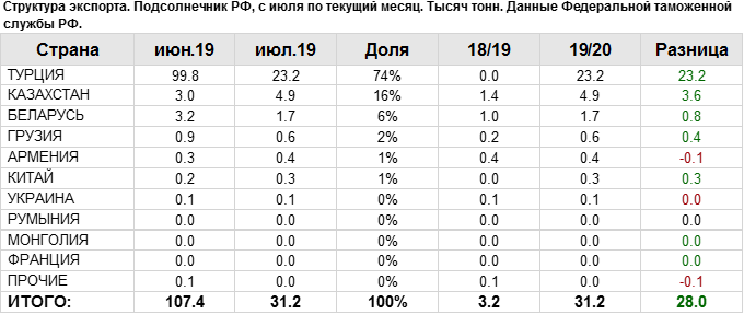 Объем поставок подсолнечника на экспорт за июль 2019 года в Турцию составил 23.19 тыс. тонн, что на 23.19 тыс. тонн больше объема поставок в данную страну в прошлом сезоне на тот же отчетный месяц.