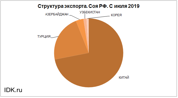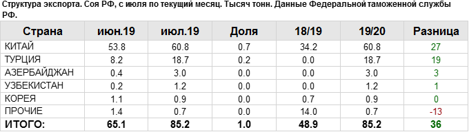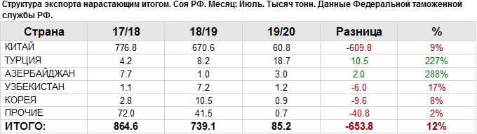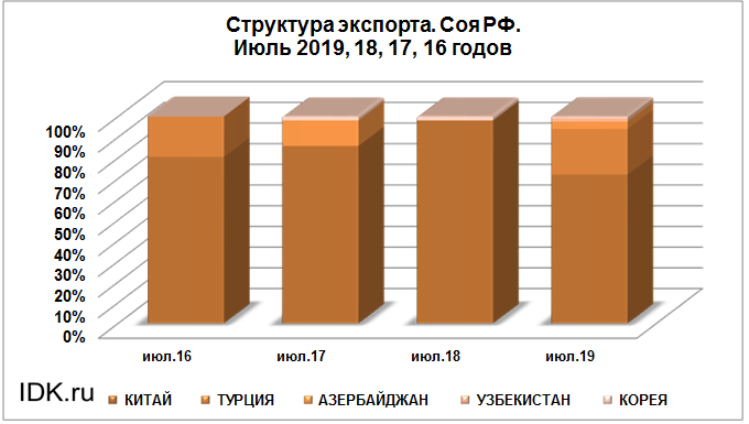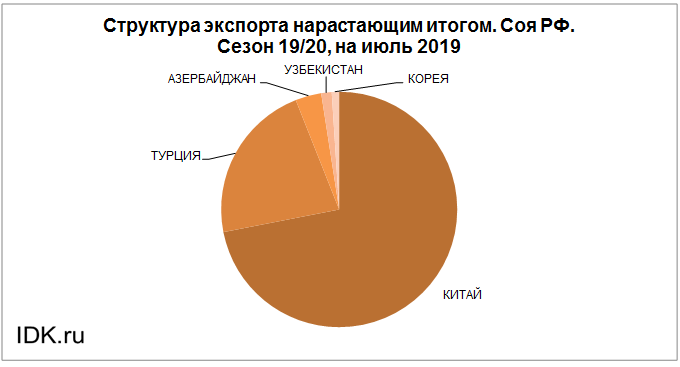 Объем поставок сои на экспорт за июль 2019 года в Китай составил 60.83 тыс. тонн, что на 26.62 тыс. тонн больше объема поставок в данную страну в прошлом сезоне на тот же отчетный месяц.