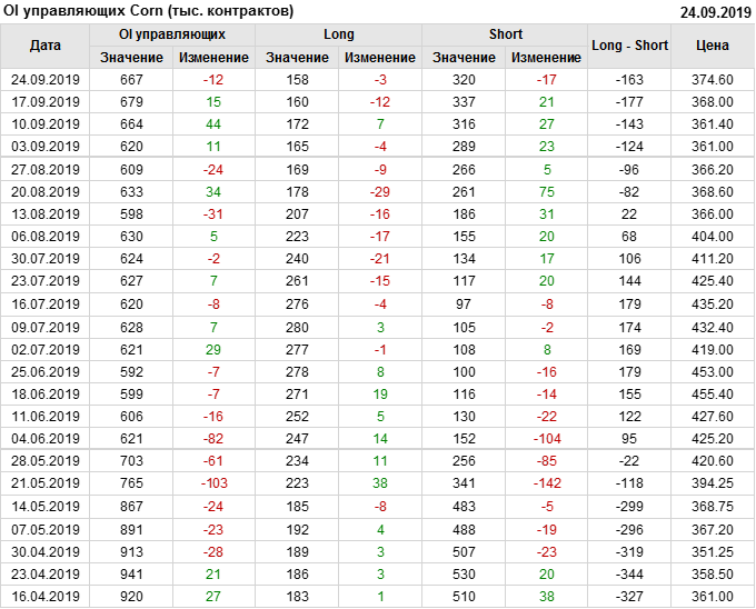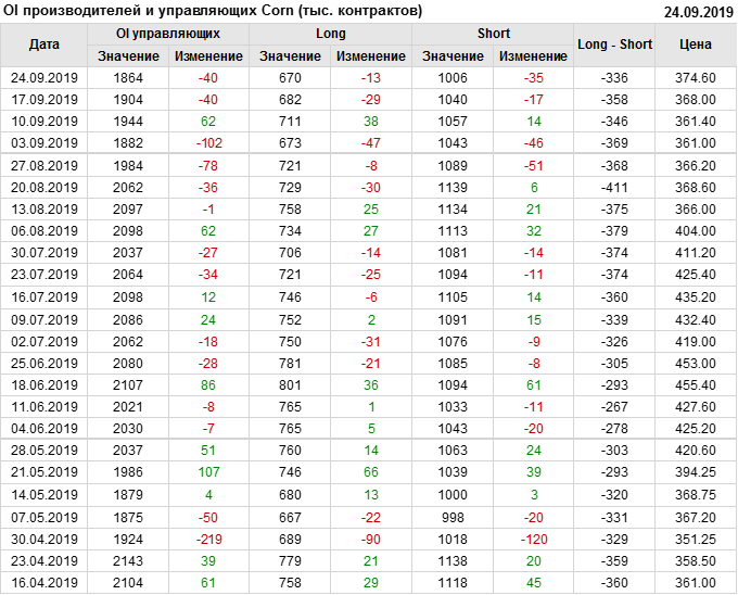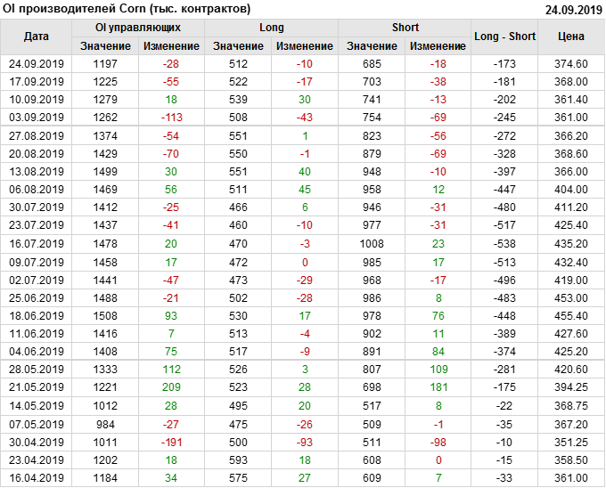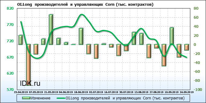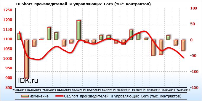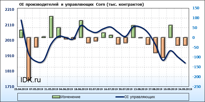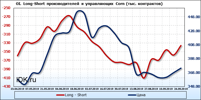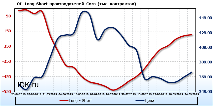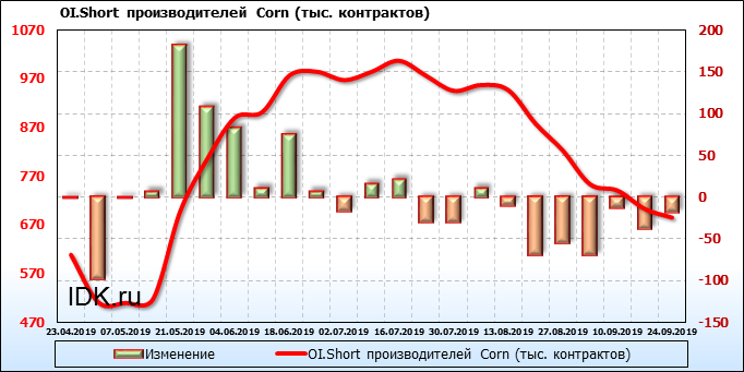 За прошлую неделю, 18.09.19 — 24.09.19, разница между длинными и короткими позициями производителей выросла на 8 тыс. контрактов. В тоже время, цена выросла на 6.6 цента. Производители не торопятся наращивать продажи, предполагая, что возможен рост цены в ближайшее время.
