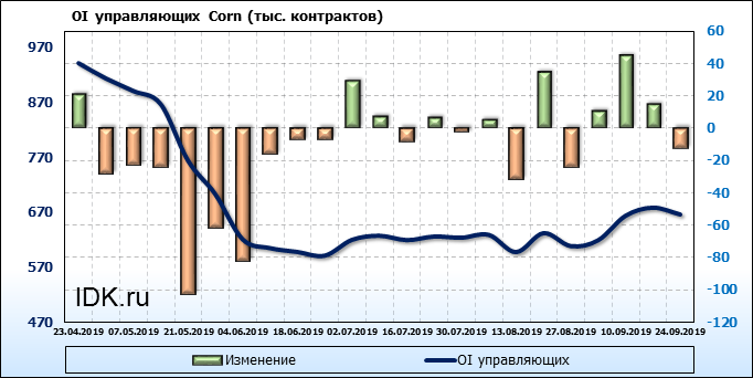 За прошлую неделю, 18.09.19 — 24.09.19, разница между длинными и короткими позициями управляющих выросла на 14 тыс. контрактов. В тоже время, цена выросла на 6.6 цента. Управляющие наращивают позиции, разгоняя тем самым рост цен, что говорит нам о текущей силе рынка.