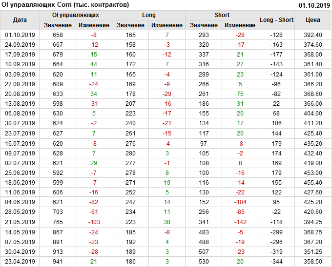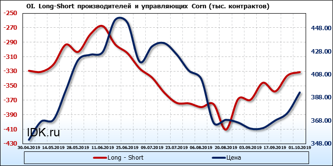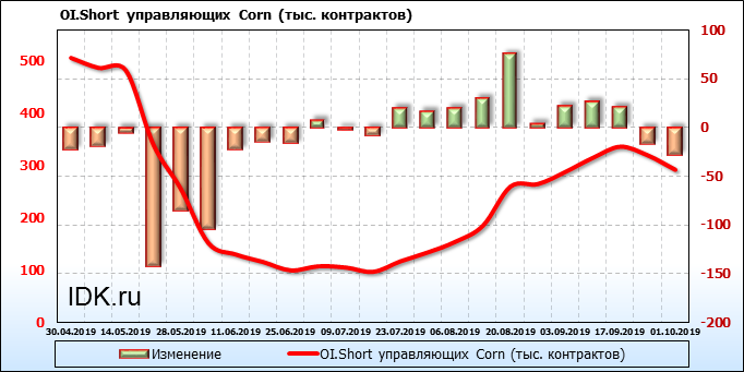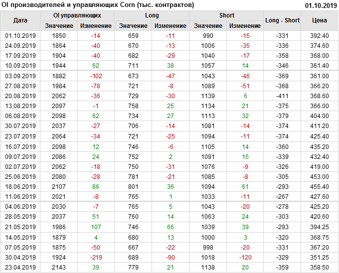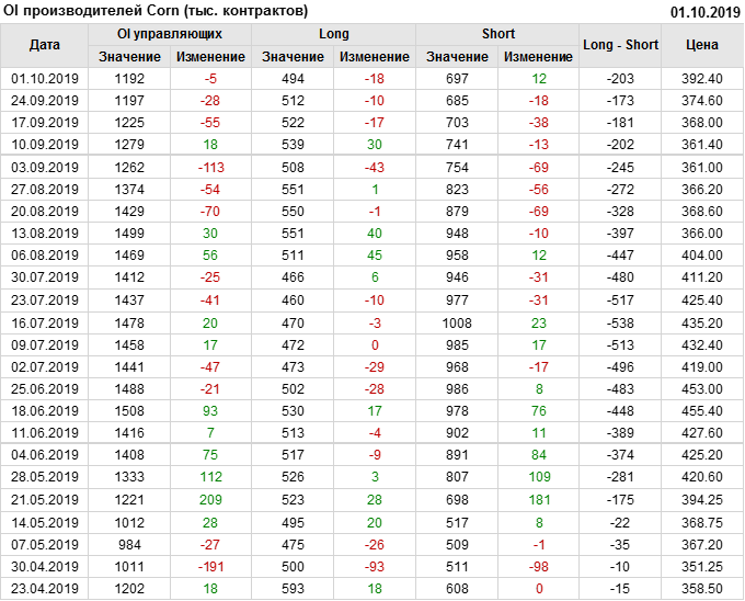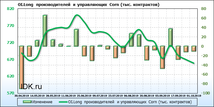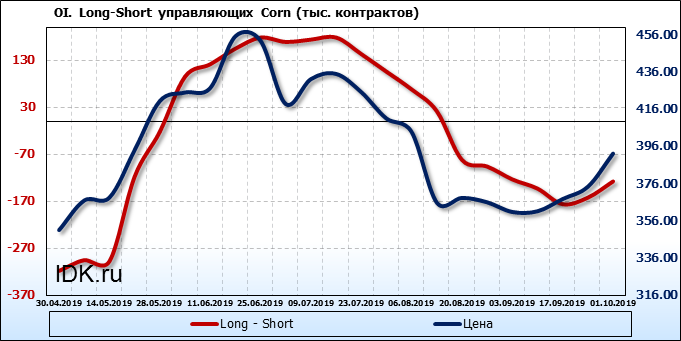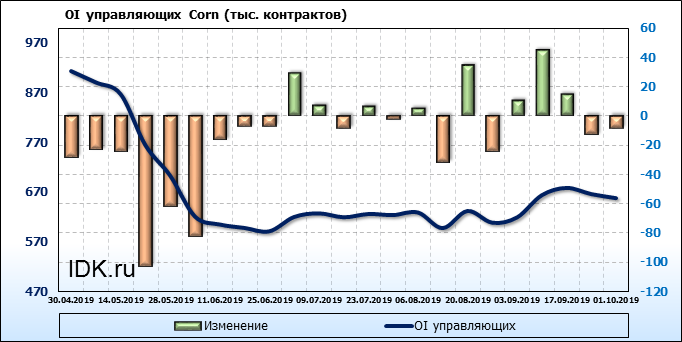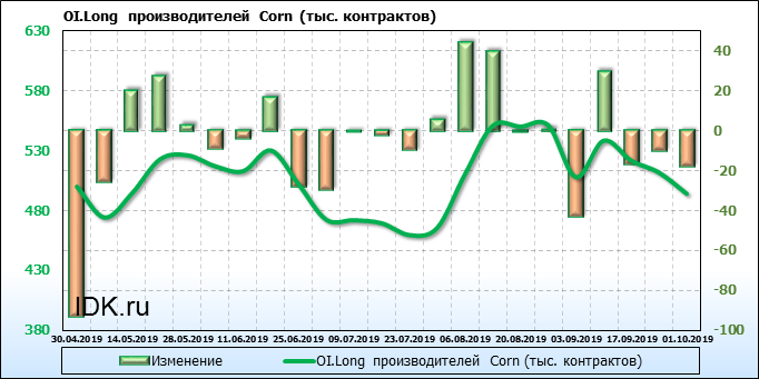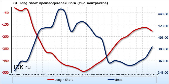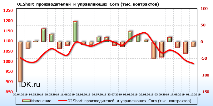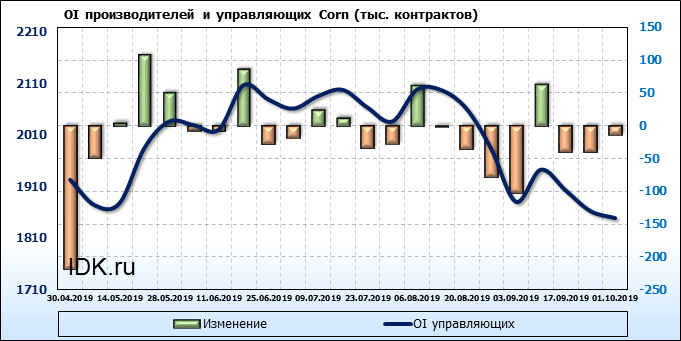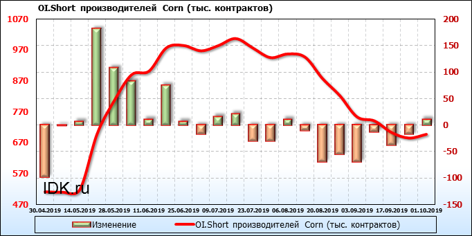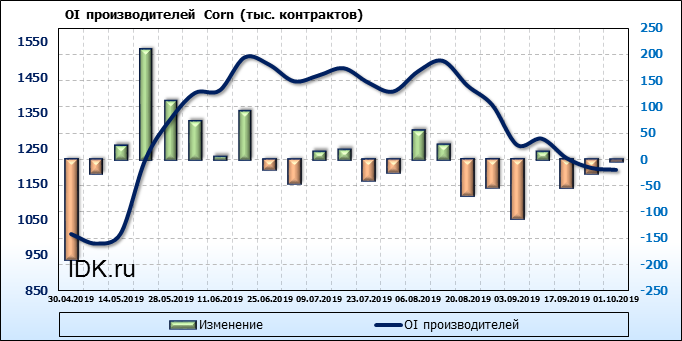За прошлую неделю, 25.09.19 — 01.10.19, разница между длинными и короткими позициями производителей упала на 30 тыс. контрактов. В тоже время, цена выросла на 17.8 цента. Производители увеличивают продажи, предполагая, что текущие уровни являются привлекательными для них. И не смотря на это, рынок продолжает расти, что показывает силу текущего тренда.