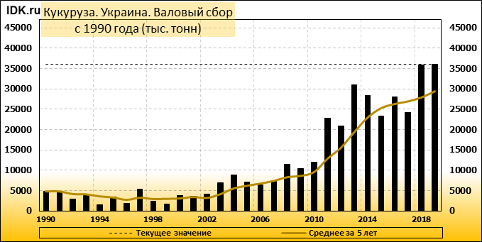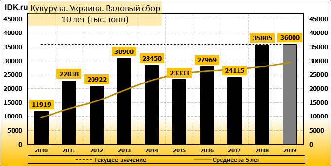 Согласно новому отчету МСХ США, производство кукурузы в Украине в 2019/20 году оценивается в 36,0 млн. метрических тонн, без изменений по сравнению с прошлым месяцем, но на 0,54 процента больше, чем в прошлом году. Урожайность не изменилась со времени публикации сентябрьского прогноза и оценивается в 7,35 тонны с гектара, в то время как прошлогодний показатель оценивается в 7,84 тонны с гектара. Предполагаемая уборочная площадь также не изменилась с прошлого месяца и составляет 4,9 млн. га, по сравнению с 4,57 млн. га в прошлом году.