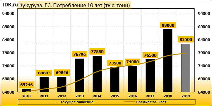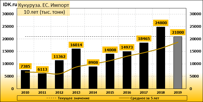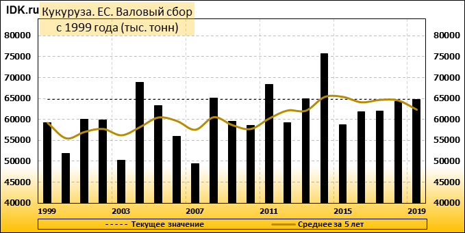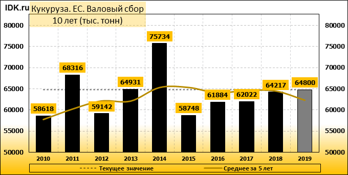 В новом отчете WASDE Министерства Сельского Хозяйства США прогноз производства кукурузы в Европейском союзе на 2019/20 год не изменился с сентября и по-прежнему составляет 64,8 млн. тонн. При этом ожидаемая площадь сокращена с 8,65 млн. га до 8,61 млн. га, а урожайность напротив увеличена с 7,50 т/га до 7,53 т/га. Оценка прогнозируемого импорта кукурузы в Европейский союз в 2018/19 году повышена на 800 тыс. тонн до 24,8 млн. тонн на основании имеющихся торговых данных. Прогнозируемый импорт кукурузы на 2019/20 год остается на уровне 21 млн. тонн.