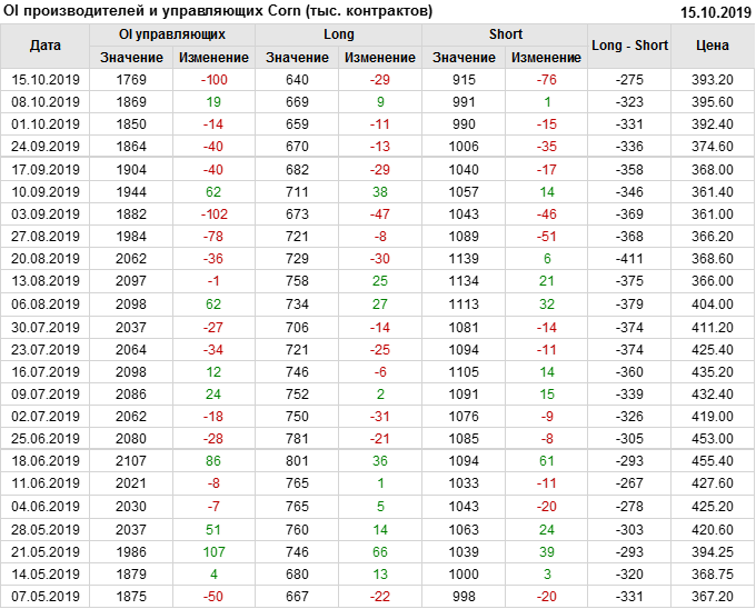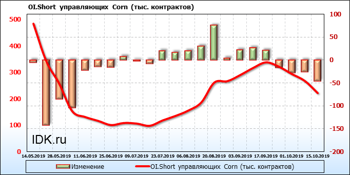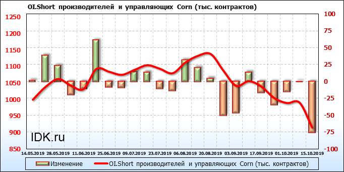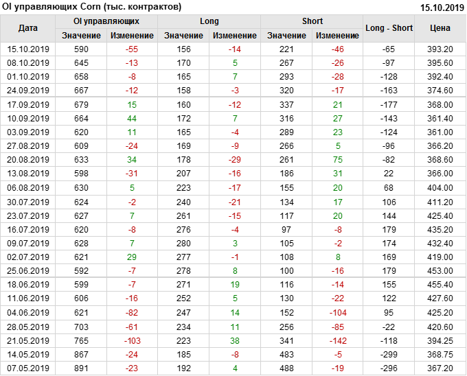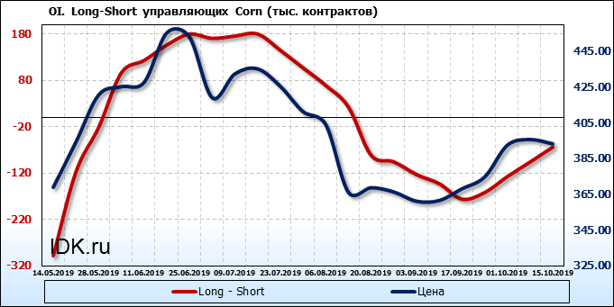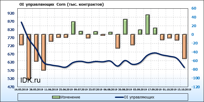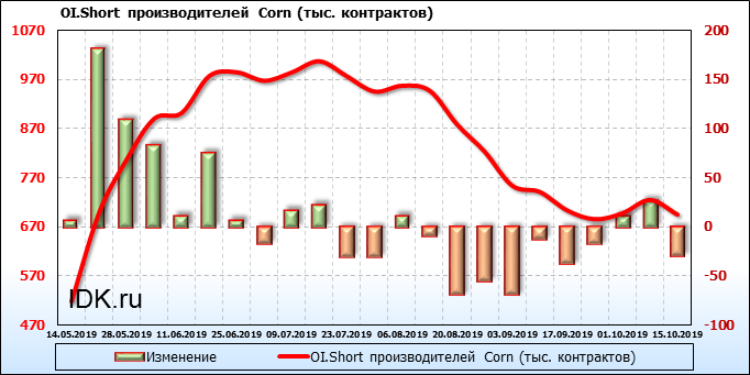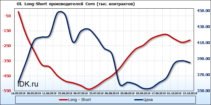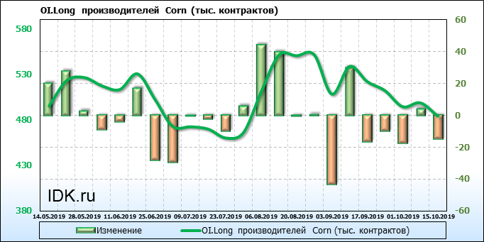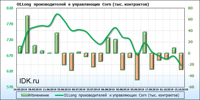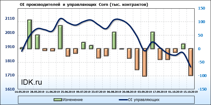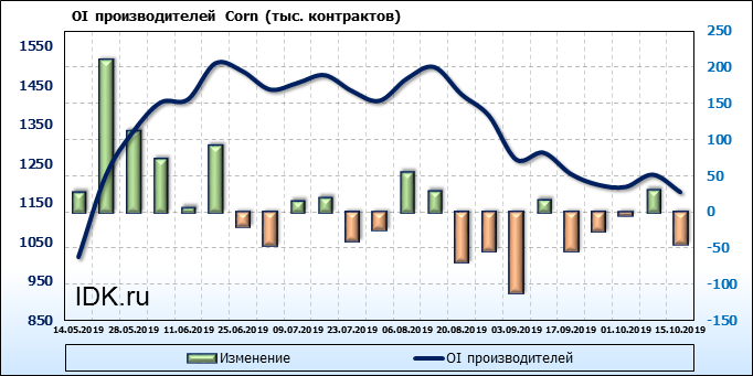 За прошлую неделю, 09.10.19 — 15.10.19, разница между длинными и короткими позициями производителей выросла на 15 тыс. контрактов. В тоже время, цена упала на 2.4 цента. Производители перестали наращивать короткие позиции, что говорит или о непривлекательности текущих ценовых уровней для хеджирования, или о том, что часть участников рынка заняла выжидательную позицию.