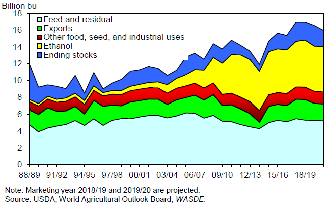 В отчете NASS о переработке зерна и производстве сопутствующих продуктов окончательное потребление кукурузы для производства этанола в 2018/19 году оценивается в 5 376 млн. (5,376 млрд.) бушелей, что на 1,1 млн. бушелей выше, чем прогнозировалось в прошлом месяце. На 2019/20 г. прогнозируемое потребление кукурузы для производства топливного этанола снижено на 50 млн. бушелей до 5 400 млн. (5,4 млрд.) на основании наблюдаемых на сегодняшний день данных.