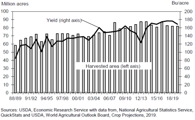 Рисунок 3. Уборочная площадь и урожайность кукурузы в США.