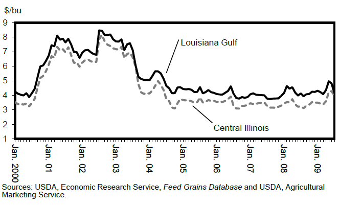 Рисунок 4. Цены на кукурузу по месяцам (yellow #2) в Центральном Иллинойсе и Луизиане.
