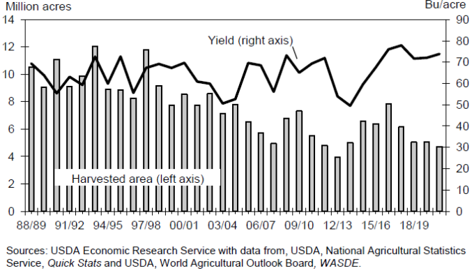 Рисунок 5. Уборочная площадь и урожайность сорго в США.