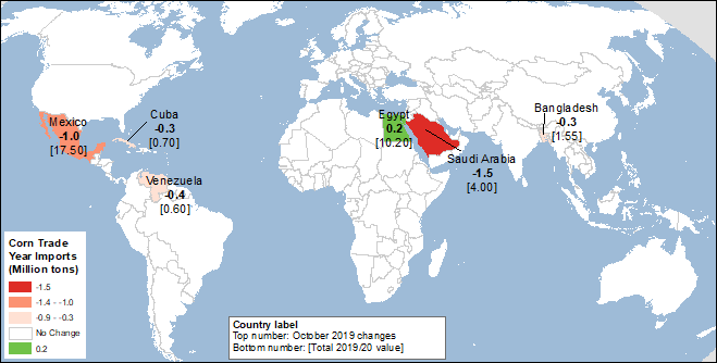 Карта 1. Изменения импорта кукурузы для 2019/20 торгового года (млн. тонн), октябрь 2019.