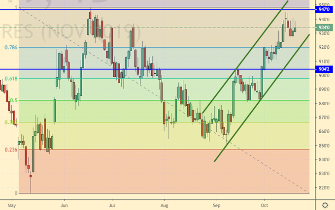 Сценарий роста: рассматриваем ноябрьский фьючерс, дата экспирации 14 ноября. Уперлись в 946.0. Пока говорить о том, что все пропало мы не можем. Цены находятся в растущем канале. Будем держать открытые ранее позиции.