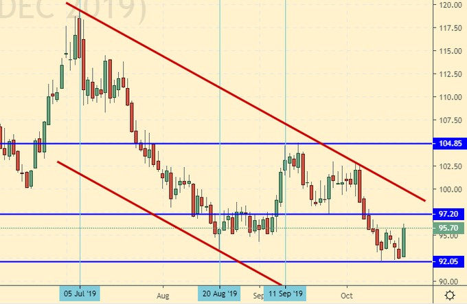 Сценарий роста: рассматриваем декабрьский фьючерс, дата экспирации 18 декабря. Рынок нашел своих покупателей от 92.00. Свеча пятницы выглядит сильно. Поверим в успех, без этого у нас никак, и купим, но только после роста выше 97.20.