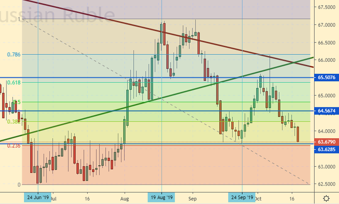 25 октября у нас заседание ЦБ РФ. Все готово к очередному снижению ставки: замедление роста экономики, низкая инфляция, политическая воля. Рубль грозится проломить 63.50. Тем не менее, всем сознательным гражданам хотелось бы услышать что-то от ЦБ, прежде чем начинать забуриваться глубже. Беремся предположить, что авансов в виде резкого падения к 60.00 на следующей неделе не будет.