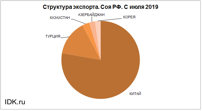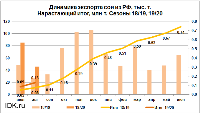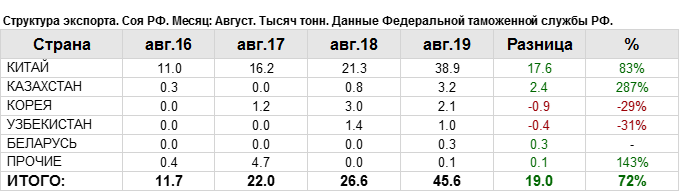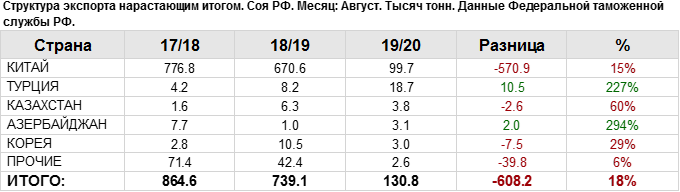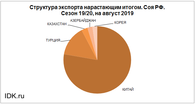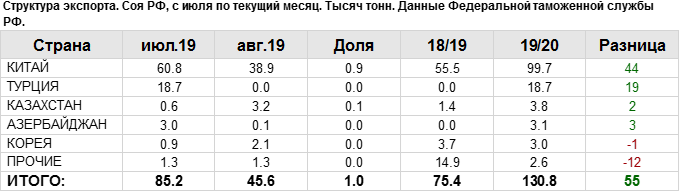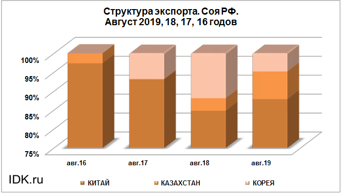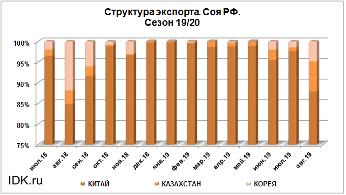 Объем поставок сои на экспорт за период с июля 2019 года по август 2019 года в Казахстан составил 3.79 тыс. тонн, что на 2.41 тыс. тонн больше объема поставок в данную страну в прошлом сезоне на тот же отчетный месяц.