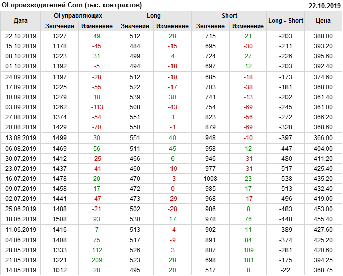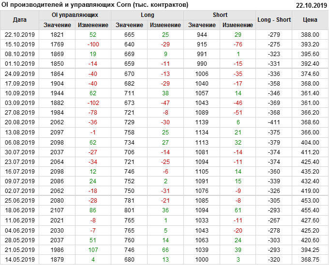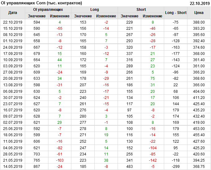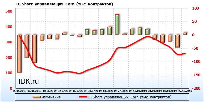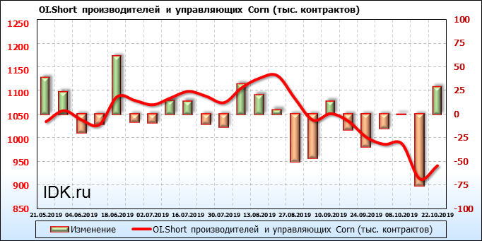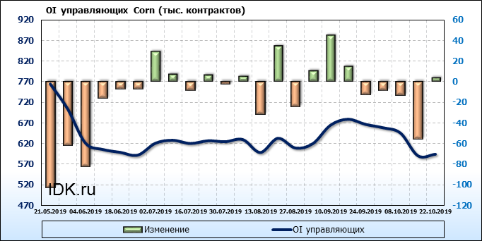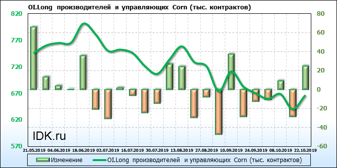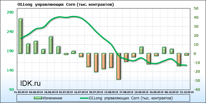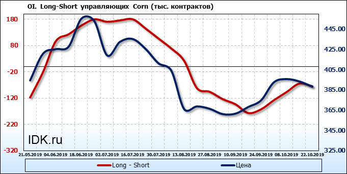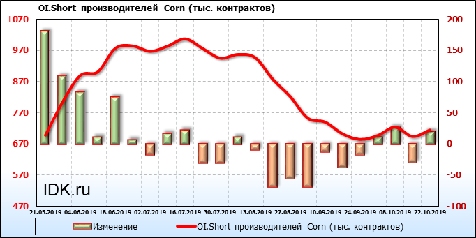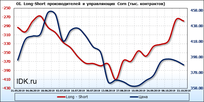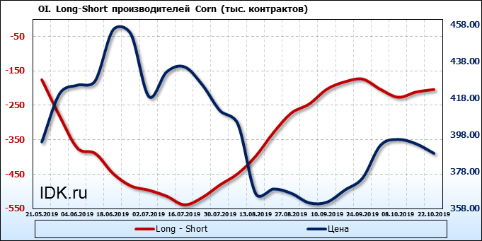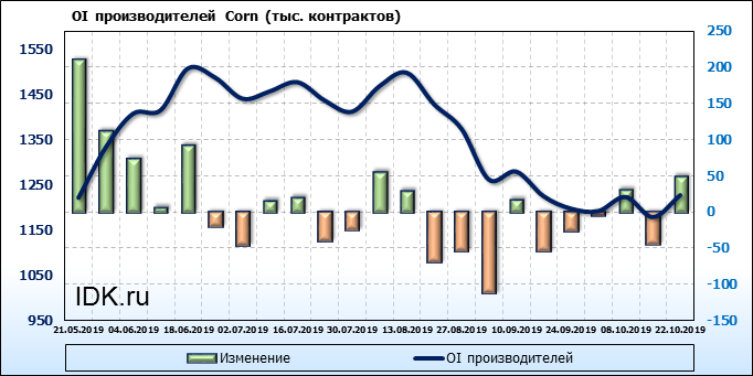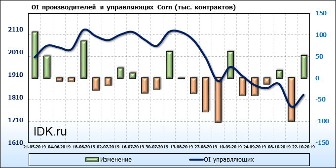 За прошлую неделю, 16.10.19 — 22.10.19, разница между длинными и короткими позициями производителей выросла на 7 тыс. контрактов. В тоже время, цена упала на 5.2 цента. Производители перестали наращивать короткие позиции, что говорит или о непривлекательности текущих ценовых уровней для хеджирования, или о том, что часть участников рынка заняла выжидательную позицию.