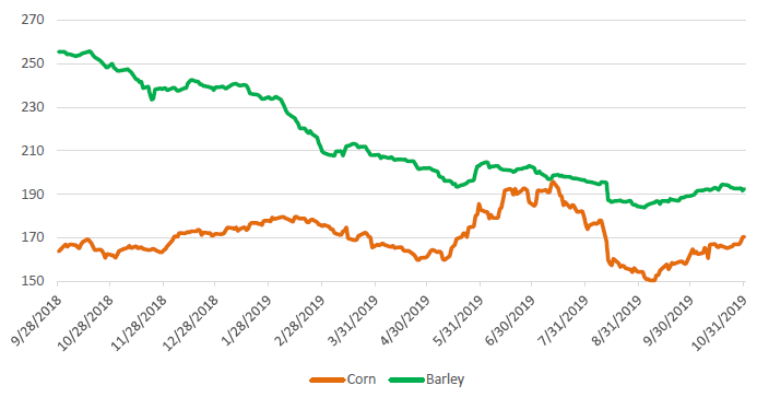 Обильные запасы и снижение спроса со стороны основных покупателей оказали общее ослабляющее влияние на цены на ячмень. Цены основных экспортеров ячменя были усреднены и сопоставлены со средними ценами на кукурузу (были усреднены экспортные цены Аргентины, Бразилии, Причерноморья и США) для аналитических целей на приведенной выше диаграмме. В прошлом году разрыв в ценах между ячменем и кукурузой сократился с более чем 80 долларов за тонну в сентябре 2018 года до почти 20 долларов за тонну в октябре 2019 года. На кукурузу действуют отдельные факторы, связанные с неопределенностью рынка в отношении размера урожая в США. В июле цены почти достигли паритета, но восстановление рыночных настроений в последующие месяцы привело к снижению кукурузы. Торговцы ячменем могут по-прежнему испытывать трудности с поиском альтернативных рынков, несмотря на растущую конкурентоспособность и доступность кормового ячменя.