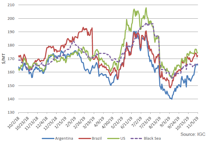 Со времени публикации октябрьского отчета WASDE, предложения основных экспортеров (кроме Аргентины) мало изменились. Цены в США выросли на 6 долл. / т до 174 долл., что отражает сохраняющуюся неопределенность по поводу запасов в связи с погодой во время сбора урожая. Аргентинские цены подорожали на 13 долларов за тонну до 165 долларов из-за спекуляций о возможных изменениях политики при вновь избранном правительстве. Бразильские цены выросли на 4 долл. / т до 172 долл., что обусловлено высоким зарубежным спросом. Черноморские цены повысились на 2 доллара за тонну до 166 долларов.