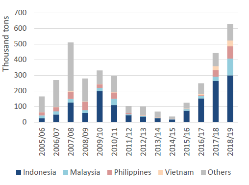 Изменения на мировом рынке для 2018/19 МГ (тыс. тонн), основанные на торговых данных